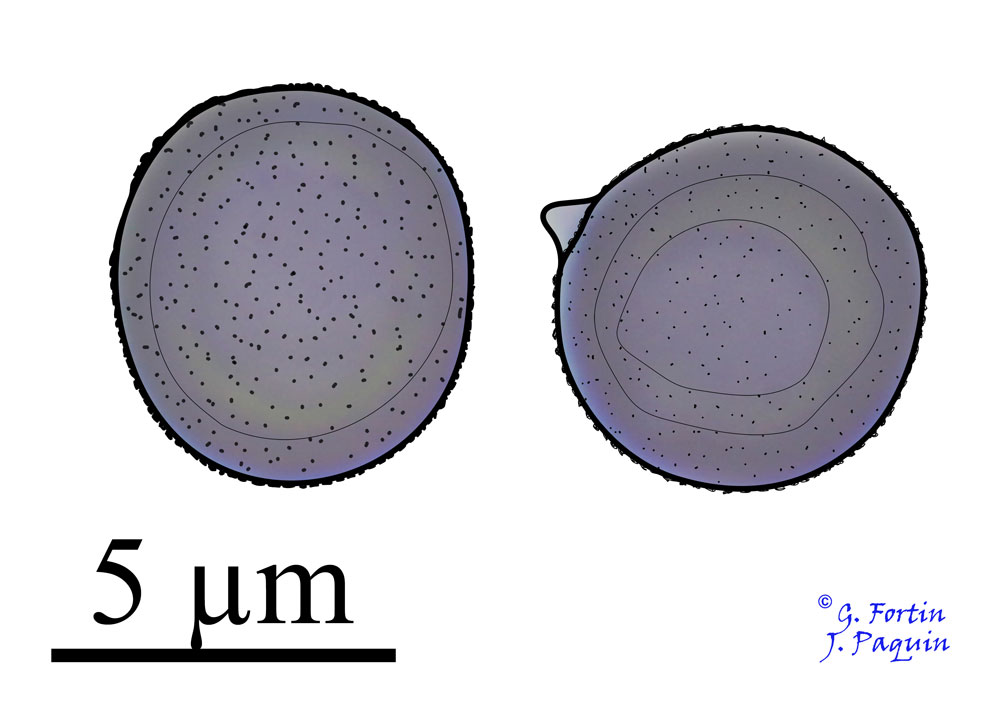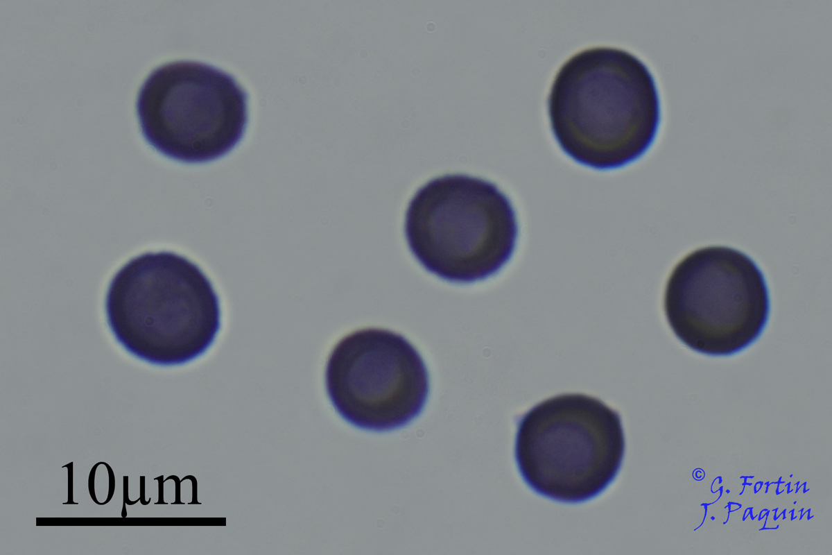 La sporée est blanche. Les spores sont globuleuses à subglobuleuses, lisses ou très finement rugueuses, amyloïdes. Me = 5,9 × 5,4 µm ; N = 35 (Fig. 10 et 11).